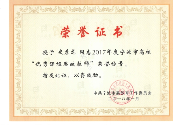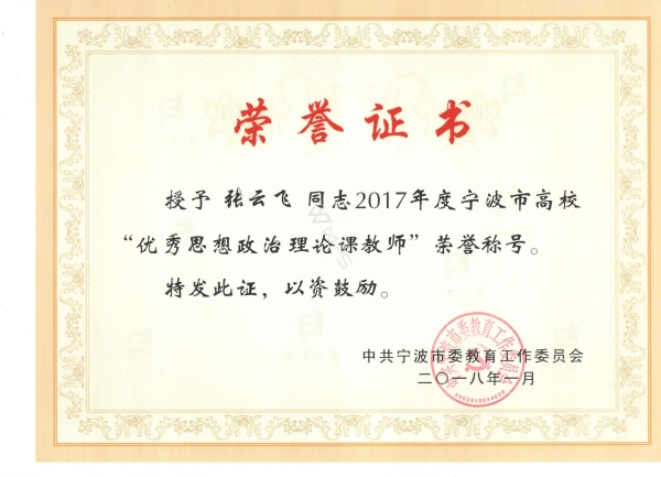 近日,接到中共宁波市委教育工作委员会通知,公司张云飞老师荣获“2017年度宁波市高校优秀思想政治理论课教师”荣誉称号,史彦龙老师荣获“2017年度宁波市高校优秀课程思政教师”荣誉称号。