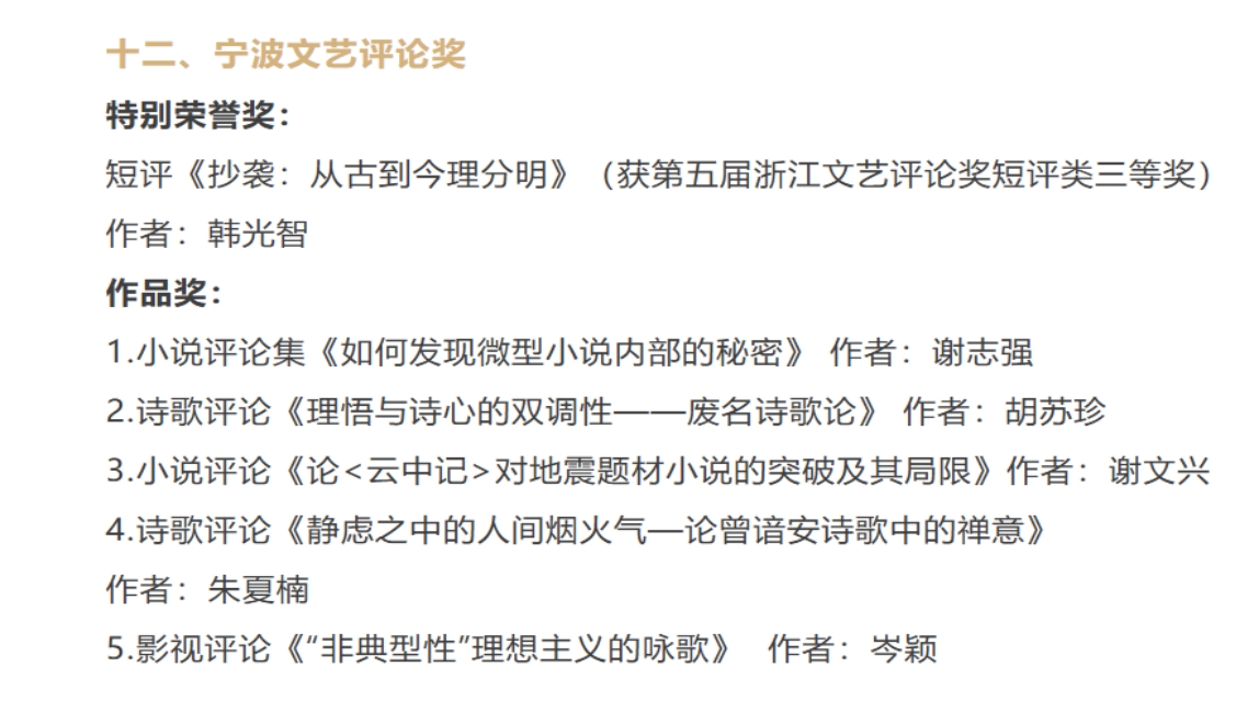 近日,宁波市各文艺门类评奖(2022-2023)获奖名单公布,公司英国365集团官网谢文兴博士凭借文学评论《论〈云中记〉对地震题材小说的突破及其局限》获得“宁波文艺评论奖”。