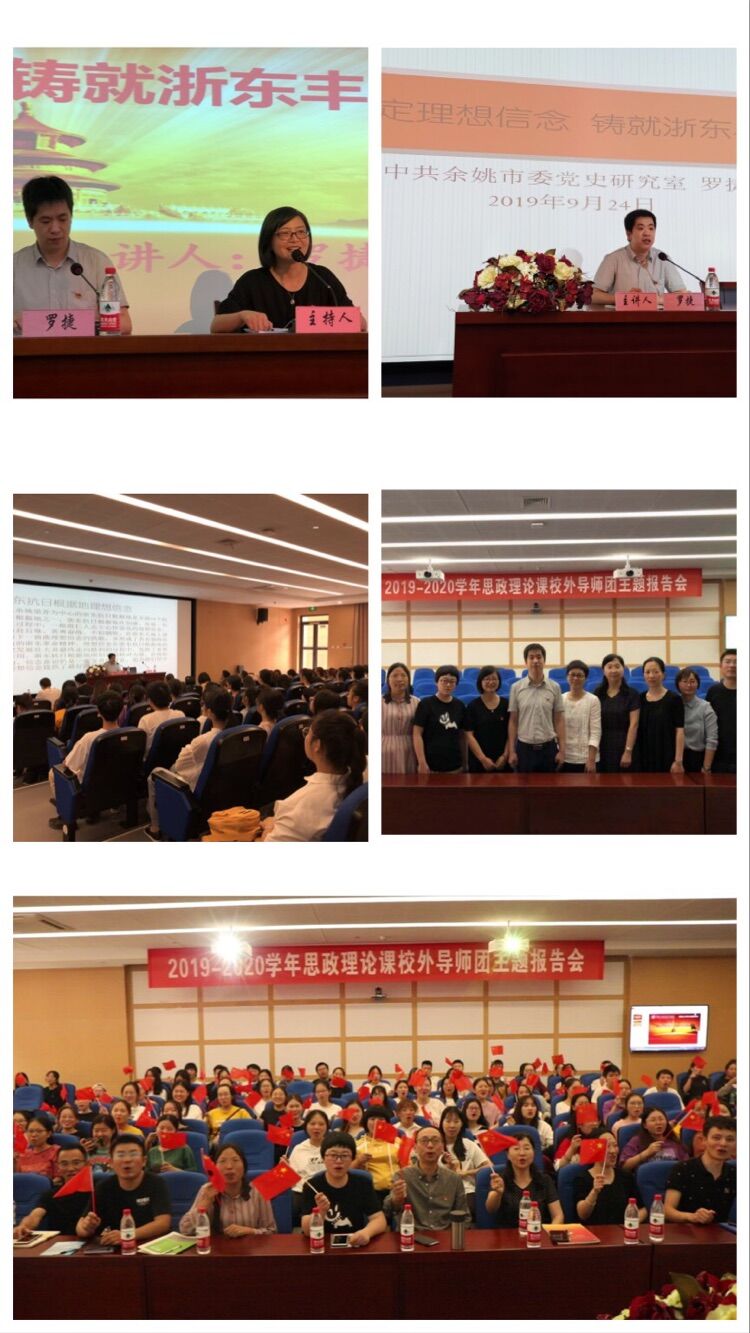 9月24日下午,在图书馆报告厅,英国365集团官网成功举办了庆祝新中国成立七十周年讲座暨2019年思政理论课校外导师团主题报告会。讲座邀请到中共余姚市委党史研究室罗捷副主任为广大师生作了“坚定理想信念,铸就浙东丰碑”为主题的报告。英国365集团官网经理何俊峻主持了报告会,公司领导、全体思政专任教师及190余名员工参加了学习。