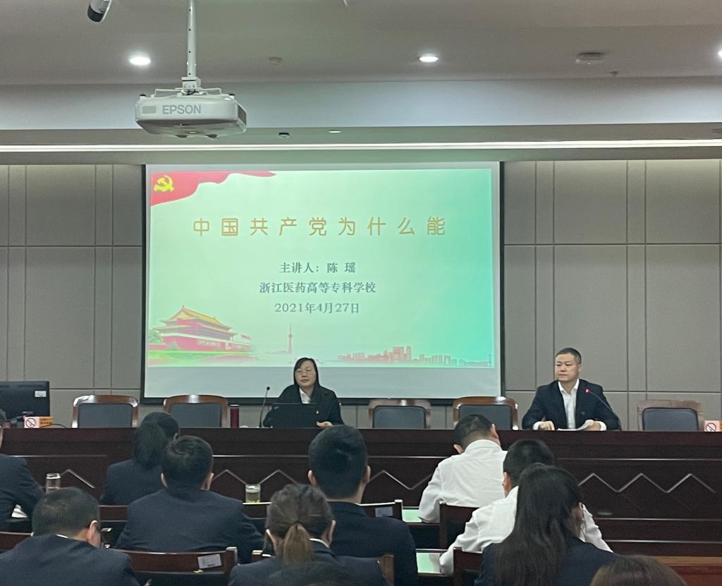 2021年4月27日,英国365集团官网思政教师陈瑶应邀赴奉化区行政服务中心开展党史主题教育宣讲,奉化区行政服务中心100余位党员同志参加了宣讲会。