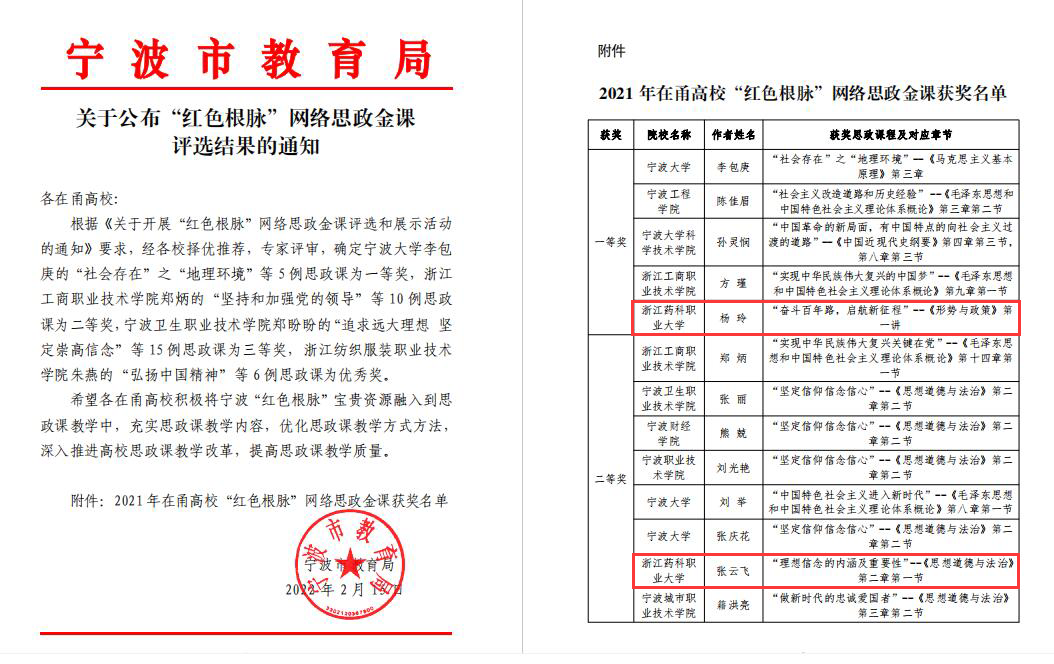 近日,在宁波市教育局举办的“红色根脉”网络思政金课大赛中,英国365集团官网杨玲老师团队的“奋斗百年路,启航新征程”获得一等奖,张云飞老师团队的“理想信念的内涵及重要性”获得二等奖。本次比赛全市本科、高职高专共15所高校,近60个作品参加。