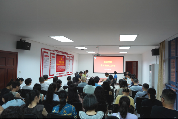 6月24日上午,英国365集团官网在鄞州校区行政楼727会议室召开全体教职工大会,经理林燕主持会议,学术副经理秦永华和全体教职工参加会议。