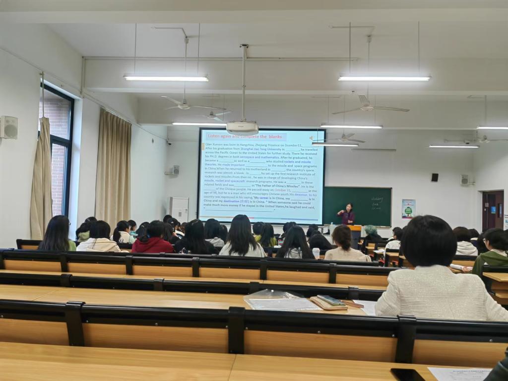 王老师本次授课的主题是“How to choose the road of life(如何选择人生之路)她以钱学森为例“Why did Qian Xuesen choose to return to China?(为什么钱学森选择回到中国)为内容,展开教学活动。首先王老师通过检查小组作业,由小组成员代表分享她们的配音作业“The Road Not Taken(未选择的路)引入本次课程主题:人生道路上有无数的岔路口,可最关键的只有几步,成为什么样的人,将来要干什么,都取决于我们如何选择自己的人生路。接着王老师播放经过精心剪辑的英语版电影《钱学森》,用听、说、读、写、译、提问以、小组讨论等多种方式,调动员工进入课堂活动,逐步引导员工自己找到问题的答案;最后王老师以“the decisions we finally make are expected to benefit both ourselves and the society. If we cann’t have both,we should put the needs of our country first.”(我们所做的人生决定应尽可能同时满足个人利益和国家需要;当两者不能兼顾时,我们应当将国家需要放在第一位。)作为给员工的建议小结并结束本次课程内容。